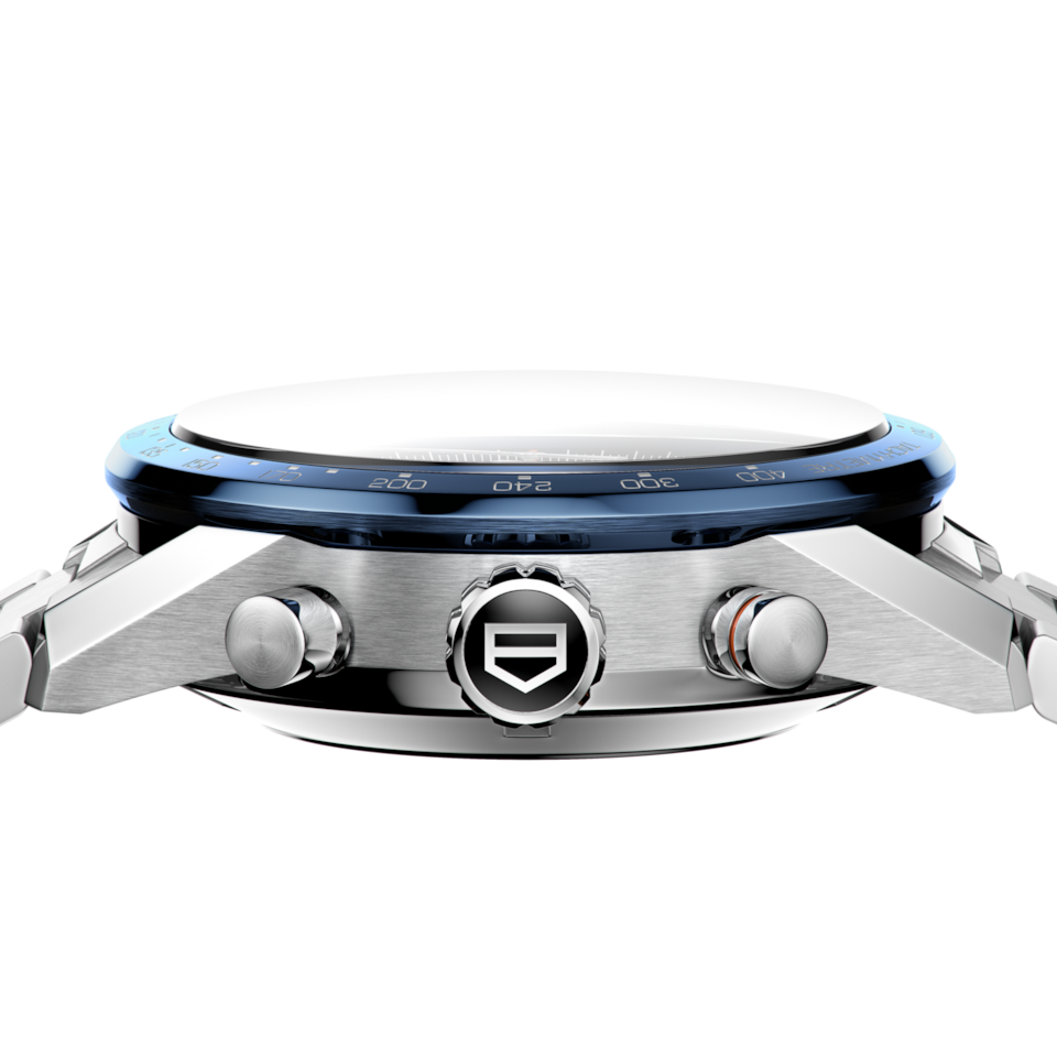 A sporty TAG Heuer Carrera combination of a blue sunray-brushed dial with traditional 6-9-12 sub-dial configuration and solid steel H-shape bracelet.